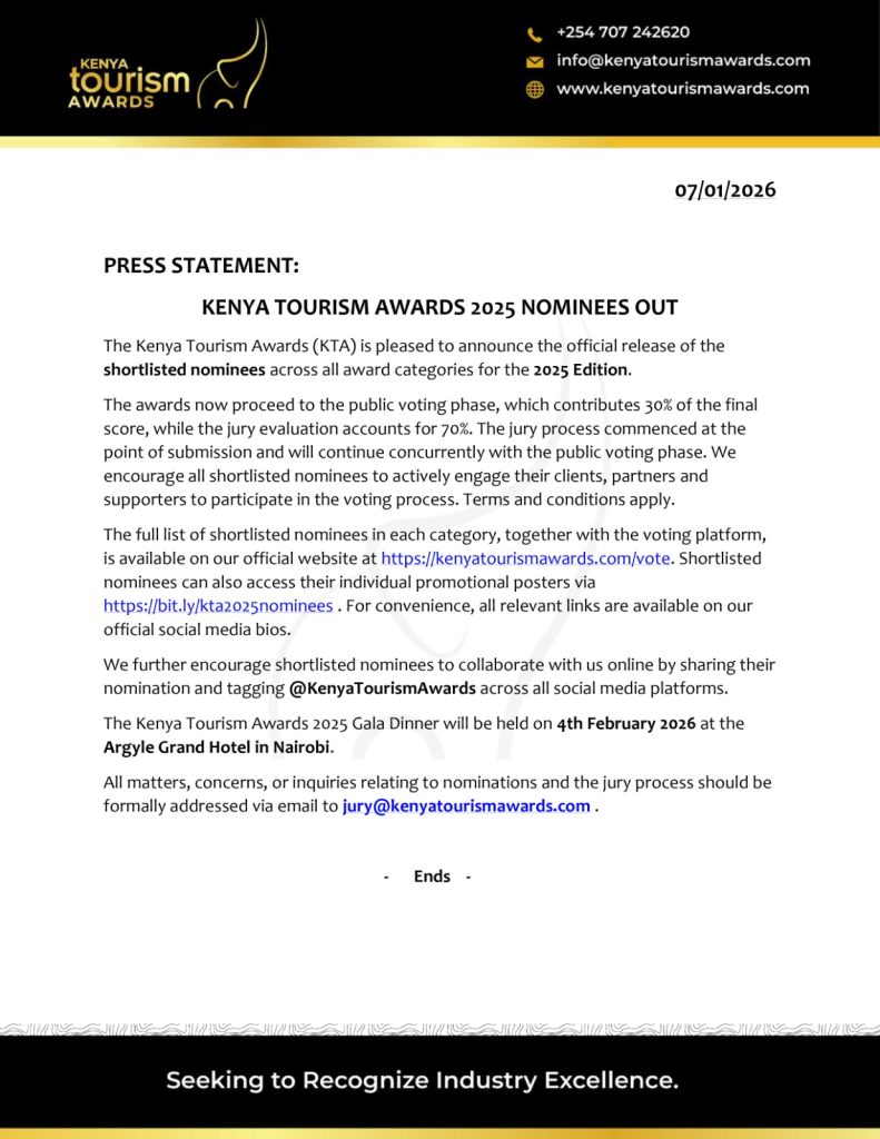 The full list of shortlisted nominees in each category, together with the voting platform, is available on our official website at https://kenyatourismawards.com/vote. Shortlisted nominees can also access their individual promotional posters via https://bit.ly/kta2025nominees . For convenience, all relevant links are available on our official social media bios.